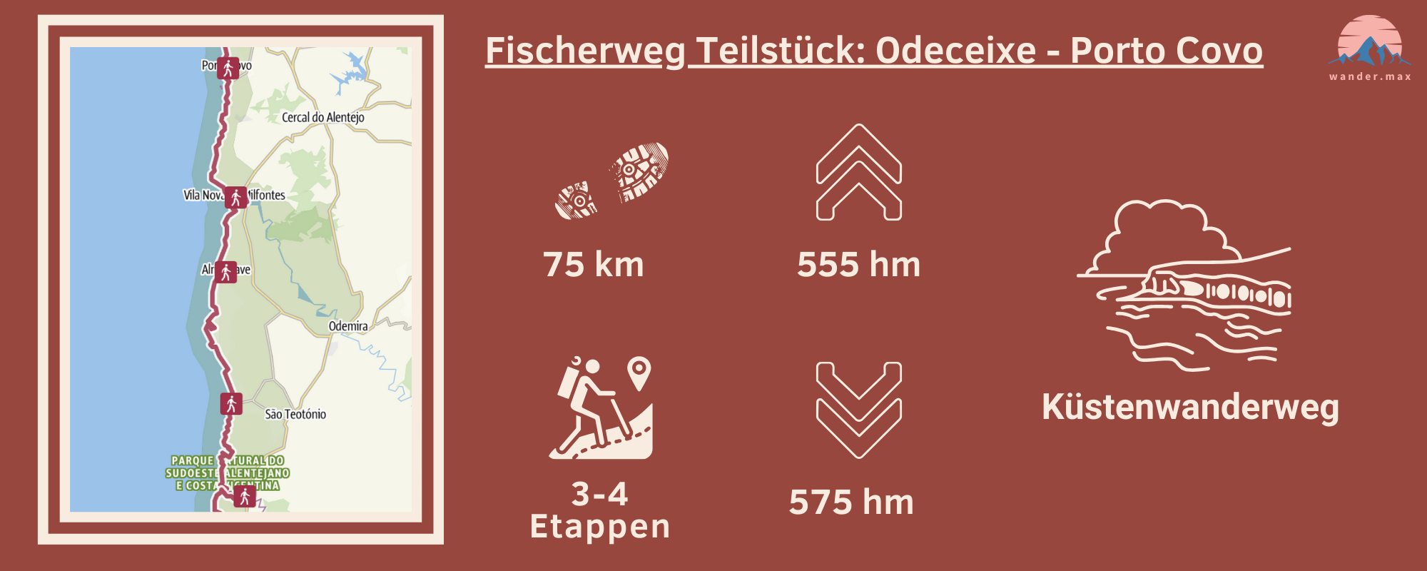 Der beliebteste Teil des Fischerwegs ist der Abschnitt von Porto Covo nach Odeceixe. Er hat eine Länge von ca. 75 km und kann in 3-4 Etappen erwandert werden.